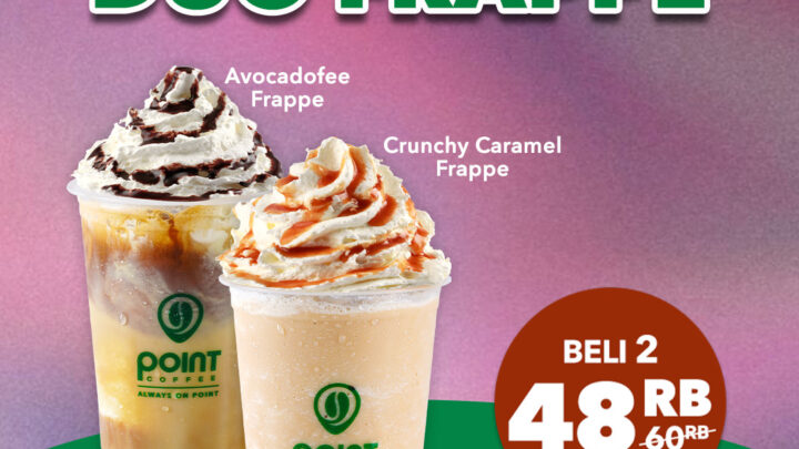 Dapatkan promo Duo Frappe beli 2 item hanya 48RIBU untuk varian Avocadofee Frappe & Crunchy Caramel Frappe khusus pembelian via Klik Indomaret / Grab Food / Shopee Food / Gofood   Periode promo: 1 – 31 Oktober 2025