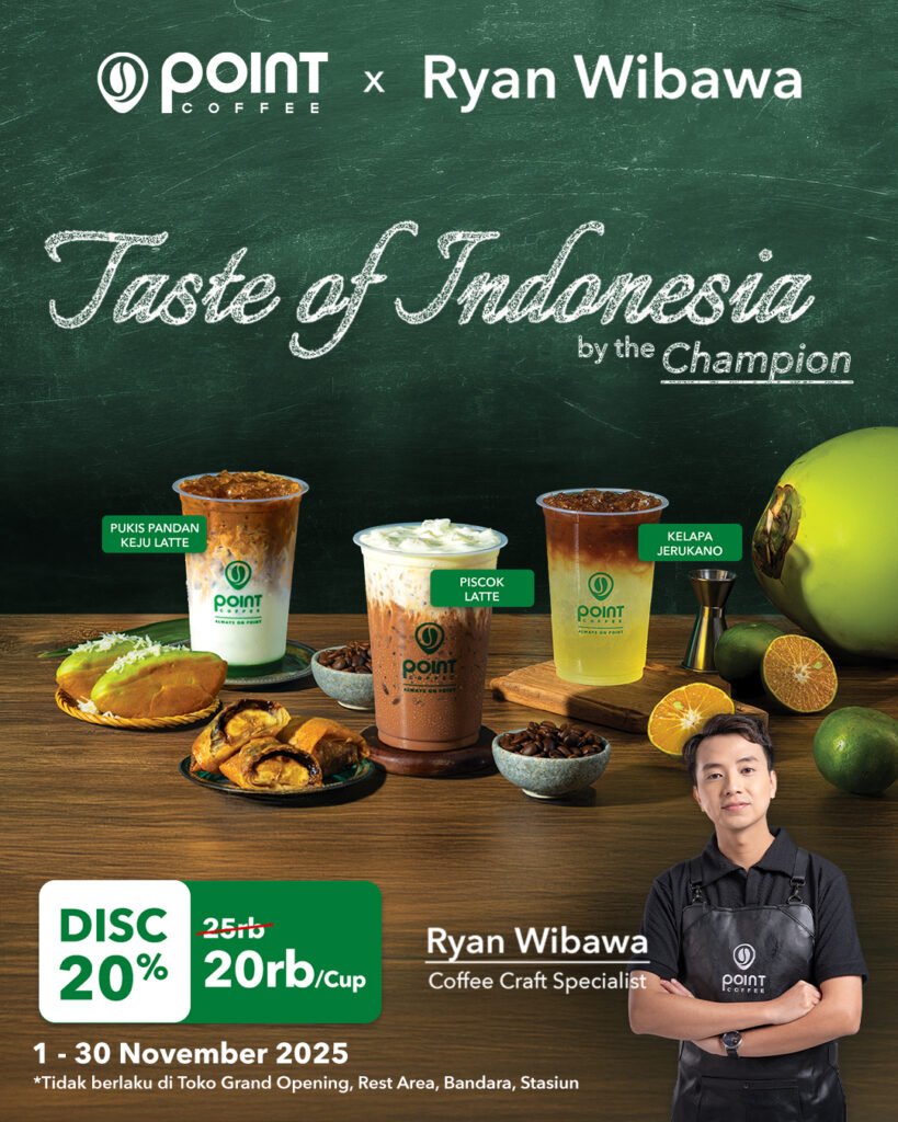 promosi-page Jangan lewatkan penawaran promo terbaik dari Point Coffee Double Signature Dapatkan promo Triple Signature bundling 2 kopi signature hanya 40RIBU khusus via Klik Indomaret / Grab Food / Shopee Food Sweet Escape Nikmati Promo Potongan 5RB Menu Baru Sweet Escape !! Oreo Coffee Cheesecake Frappe, MINUMAN BLENDED PERPADUAN RASA OREO CHEESECAKE DAN Nusantara Series Nikmati Promo Potongan 5RB Menu Baru Nusantara Series !! Satu Nusa Latte, Minuman kopi susu gula aren dan oatmilk yang Triple Signature Dapatkan promo Triple Signature bundling 3 kopi signature hanya 60RIBU khusus via Klik Indomaret / Grab Food / Shopee Food Taste of Indonesia Nikmati Promo Potongan 5RB Menu Baru Taste of Indonesia - Special Collaborations with Ryan Wibawa!! Pukis Pandan Keju Latte, minuman Promo Geng Ngopi (Sabtu, Minggu, Senin)! Dapatkan promo Geng Ngopi tiap pembelian 3 CUP kopi hanya 50RIBU di hari Sabtu, Minggu, dan Senin khusus via Klik Promo Duo Frappe Dapatkan promo Duo Frappe beli 2 item hanya 48RIBU untuk varian cookies n cream frappe & chocolate frappe khusus pembelian Promo Special Combo! Cocok buat Point People yang suka ngopi rame-rame! Nikmati promo-promo ini: Teman Ngopi Promo spesial beli 3 Palm Sugar Latte Promo Kopi 1Liter Lebih Banyak, Lebih Puas dengan kopi 1Liter dari Point Coffee! Dapatkan spesial promo beli 1 hanya 75 RIBU dan beli 1 2 Selanjutnya