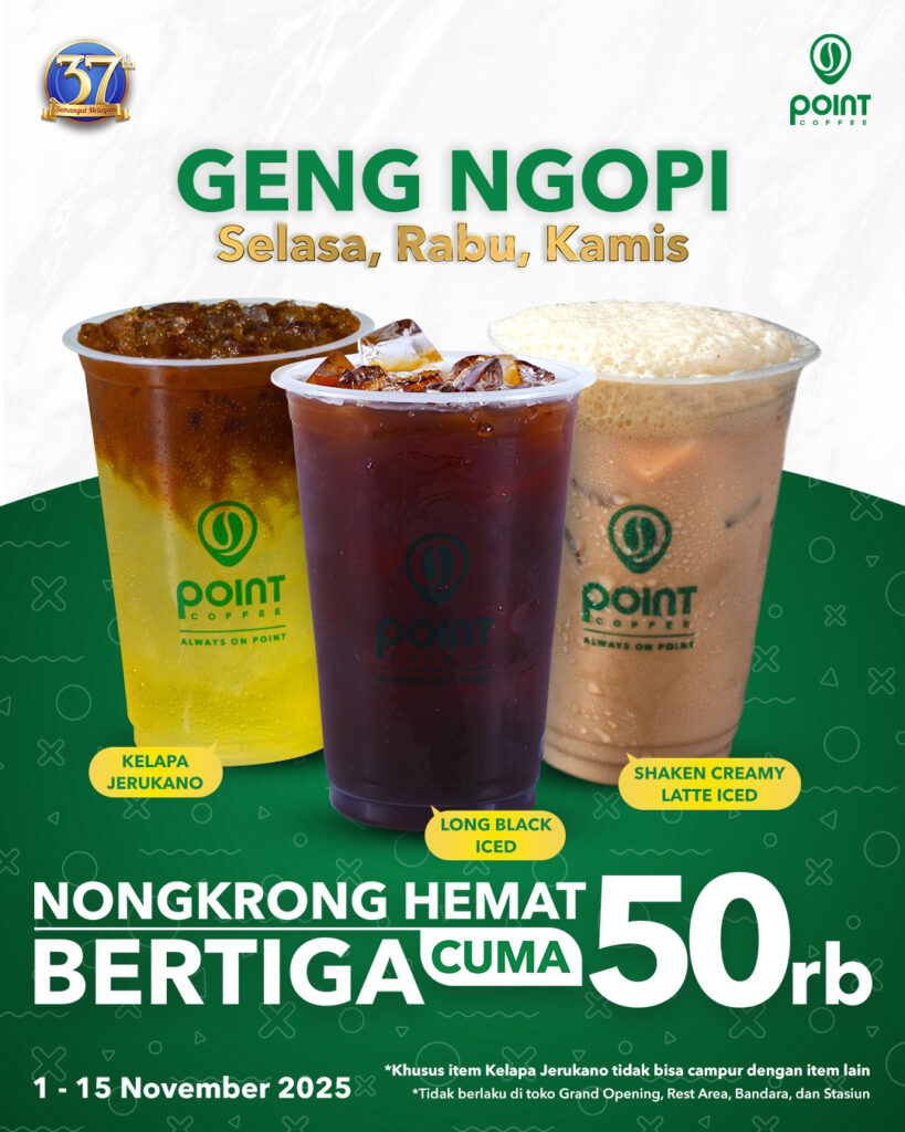promosi-page Jangan lewatkan penawaran promo terbaik dari Point Coffee Promo Shaken Series Dapatkan promo potongan 5RIBU khusus untuk pembelian item Shaken Black Lychee Yuk buruan ke Point Coffee dan nikmati promonya! Periode PROMO SPECIAL TEA! Dapatkan promo potongan 5rb pada pembelian item: Black Peach Black Lychee Lemon Tea Iced Yuk buruan ke Point Coffee dan Promo Potongan menggunakan Tumbler! Yuk bawa tumbler-mu dan beli Point Coffee! Dapatkan tambahan promo potongan 2.500 menggunakan tumbler apapun! Yuk buruan ke Point Coffee Promo Geng Ngopi (Selasa, Rabu, Kamis)! Dapatkan promo Geng Ngopi tiap pembelian 3 varian kopi hanya 50RIBU di hari Selasa, Rabu, dan Kamis khusus untuk varian: Promo KOPI BAWA PERGI Yuk stok KOPI BAWA PERGI mu di rumah dengan promo spesial tiap beli 1 botol KOPI BAWA PERGI mendapatkan POTONGAN Promo Point Coffee x Tropicana Slim GRATIS Tropicana Slim setiap pembelian minuman varian hot di Point Coffee. Yuk buruan ke Point Coffee dan nikmati promonya! Periode Sebelumnya 1 2