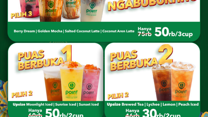 Dapatkan harga spesial PROMO RAMADHAN GENG NGABUBURHITS : pilih 3 item Berry Dream/Golden Mocha/Salted Coconut latte/Coconut Aren Latte HANYA 50RB/3cup PUAS BERBUKA 1 : pilih 2 upsize Moonlight Iced/Sunrise Iced/Sunset Iced HANYA 50RB/2 cup PUAS BERBUKA 2 : pilih 2 upsize Brewed Tea/Lychee Tea/Lemon Tea/Peach Iced HANYA 30RB/2 cup BUKBER ANTI DRAMA : dikson 8RB…